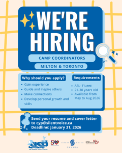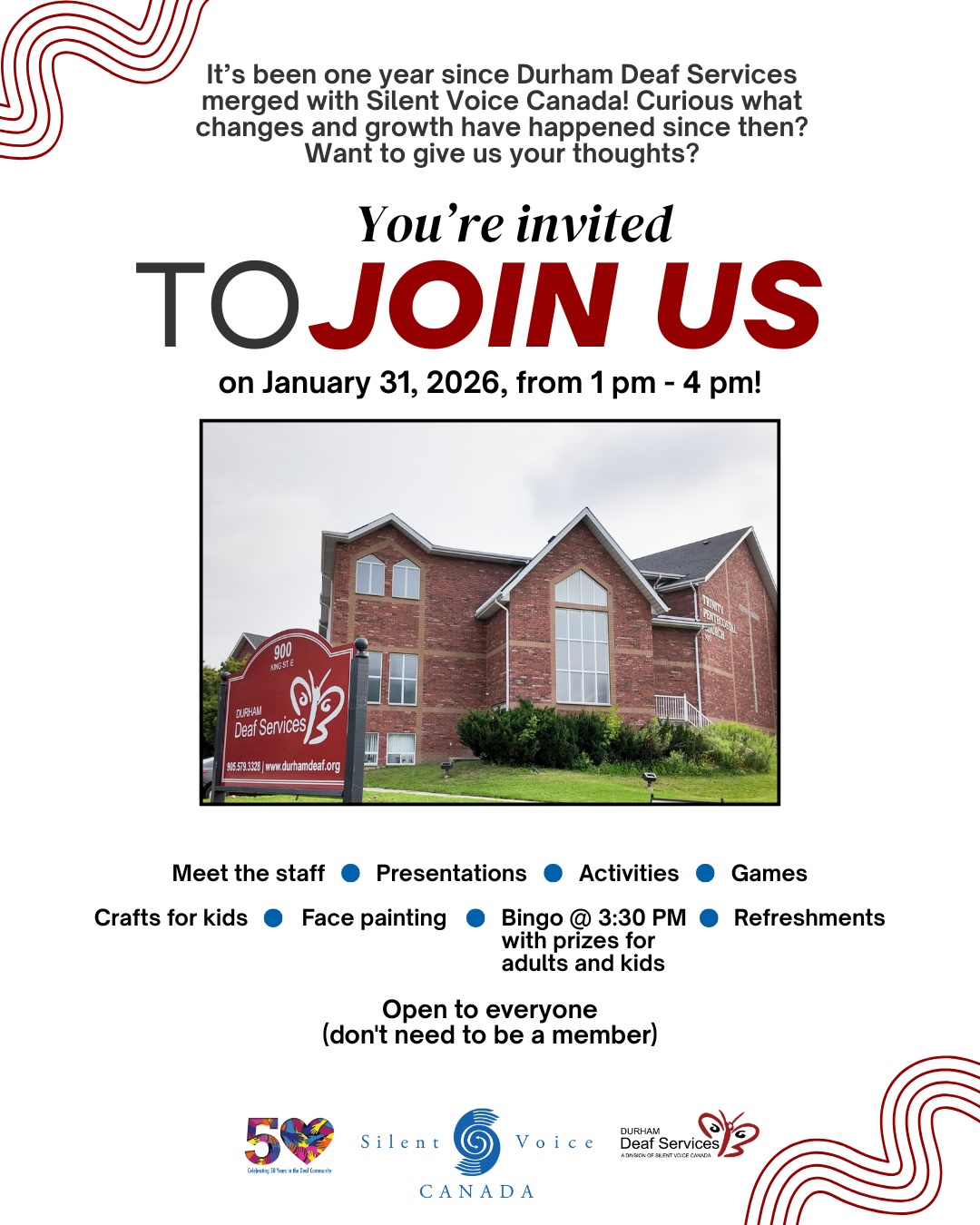 It’s been one year since Durham Deaf Services merged with Silent Voice Canada! Curious what changes and growth have happened since? Join us on January 31, 2026, from 1pm to 4pm! Open to everyone!