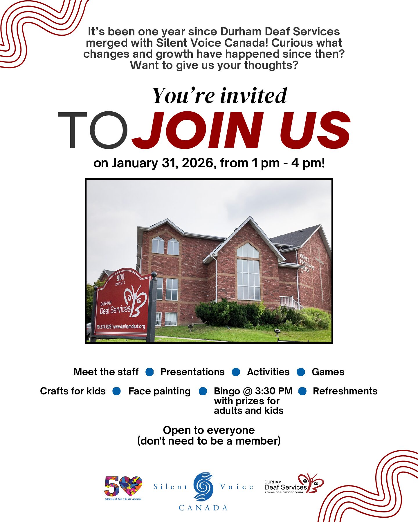 It’s been one year since Durham Deaf Services merged with Silent Voice Canada! Curious what changes and growth have happened since then? Want to give us your thoughts? You’re invited to join us on January 31, 2026, from 1pm to 4pm! Meet the staff Presentations Activities Games Crafts for kids Face painting Bingo Refreshments with […] |
