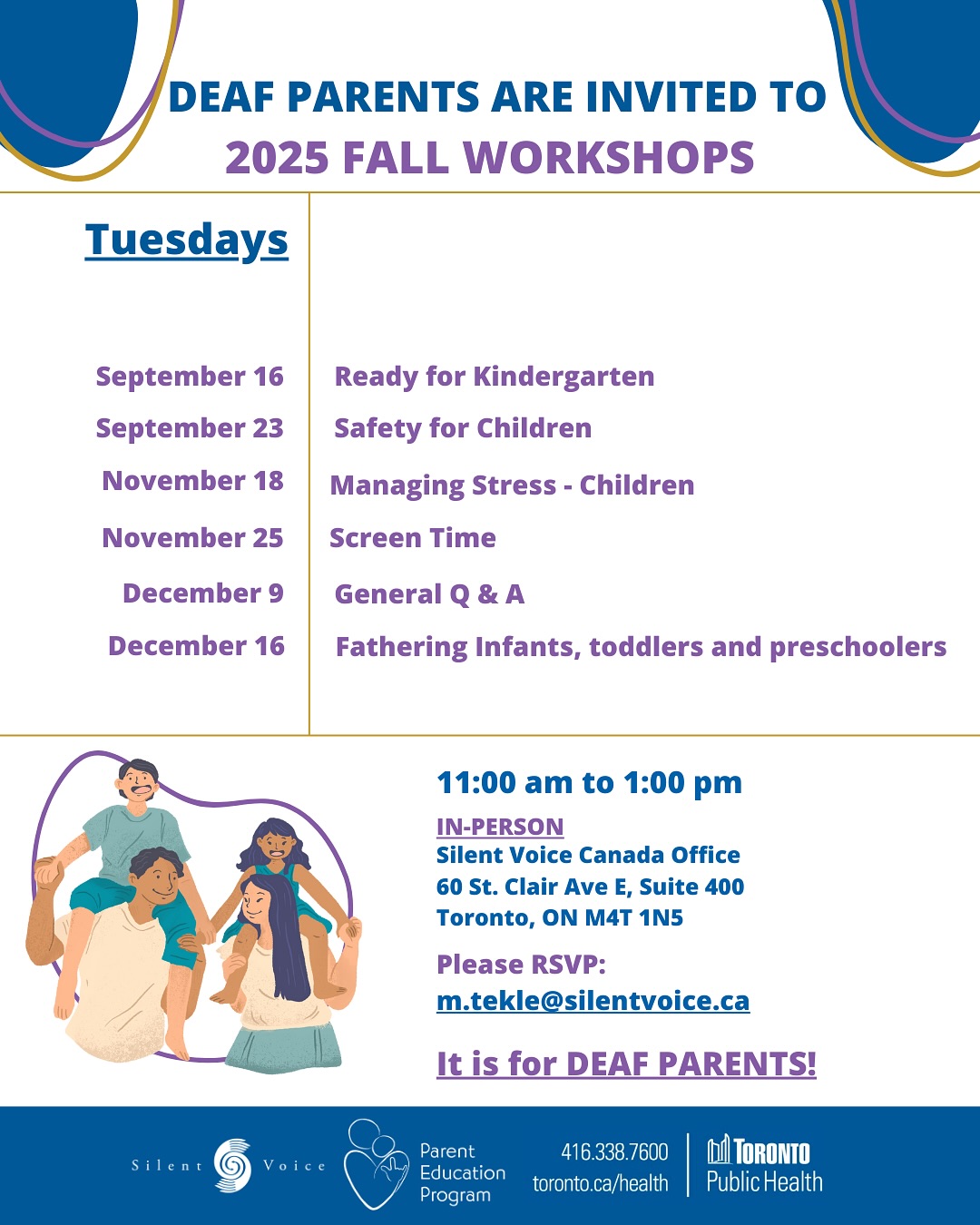 Safety for Children – September 30th from 11 am to 1 pm. This workshop is for the Deaf Parents. Please RSVP: m.tekle@silentvoice.ca.
