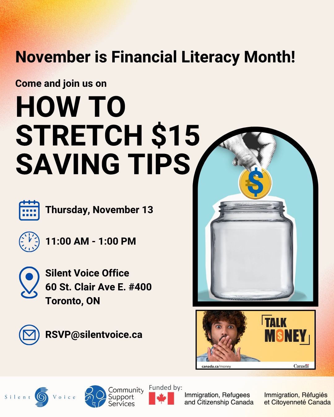 November is Financial Literacy Month! Community Support Services will host a workshop on budgeting. Do you want to see how far $15 can go!? Come to our workshop for the $15 Stretch Challenge on Thursday, November 15th, from 11 am to 1 pm! Please RSVP: rsvp@silentvoice.ca |