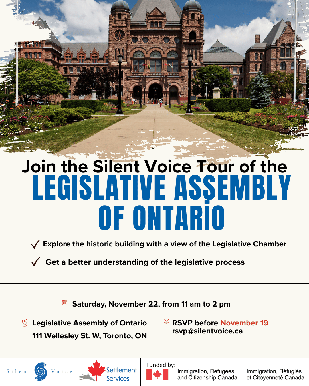 Curious about the Legislative Assembly of Ontario? Our CSS team is hosting a tour of the Legislative Assembly of Ontario in Toronto on Saturday, November 22, from 11:00 am to 2:00 pm. Join us and learn about history, art, and Ontario’s government! Please RSVP by November 19th: rsvp@silentvoice.ca