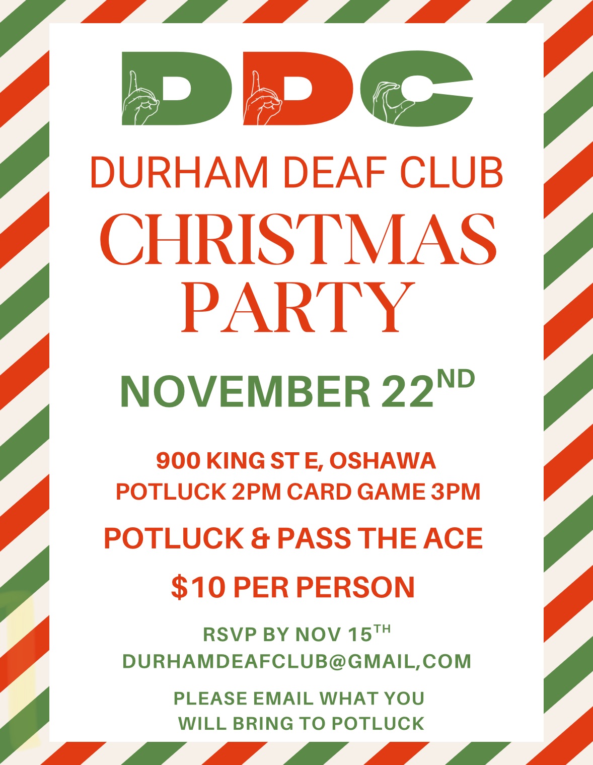 Sharing on behalf of Durham Deaf Club (DDC)! Durham Deaf Club is hosting a holiday potluck event on November 22nd, 2025. RSVP and $10.00 payment due by November 15th, 2025. Email and e-transfer can be made to durhamdeafclub@gmail.com
